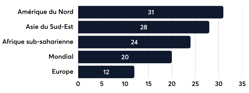 À l’échelle mondiale, les disparités régionales restent très marquées. L’Amérique du Nord mène le classement tandis que l’Europe affiche les taux les plus faibles du monde développé.