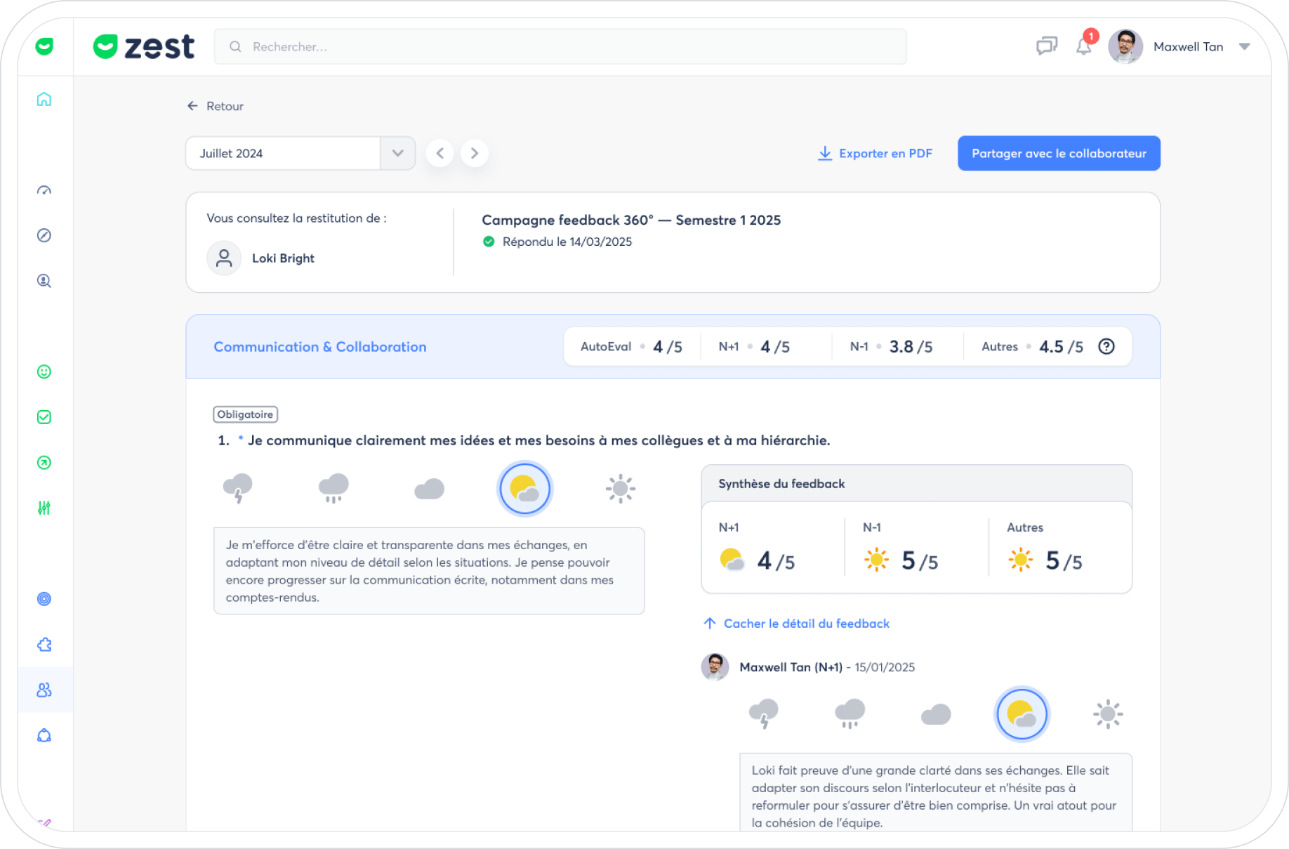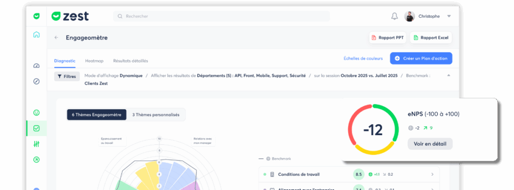 Zest offre un système d’écoute en continu qui permet d’identifier rapidement les signaux faibles et les irritants et d’avoir une vision en temps réel de l’engagement et du climat social de l’organisation.