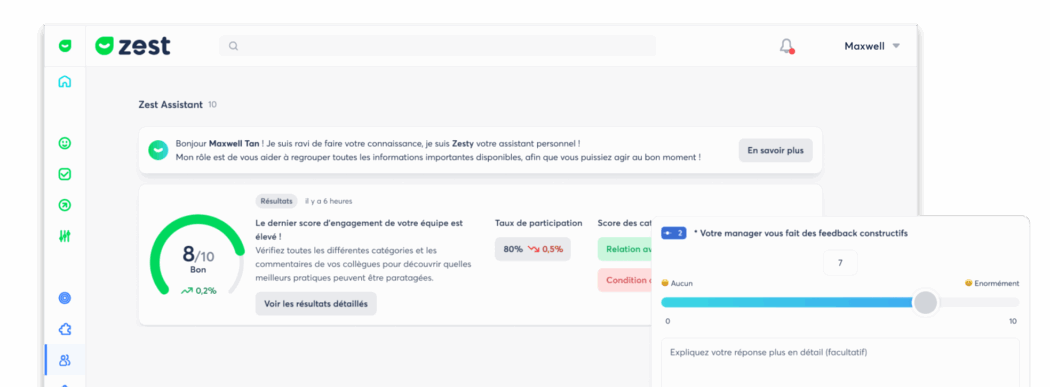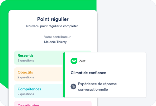 Le plus de Zest : Zest vous propose des modèles de questionnaires tout en vous laissant la possibilité de créer les vôtres. Zest est là pour vous aider, au bon moment.