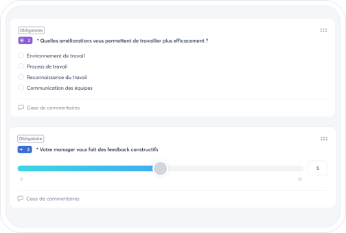 Demandez une demoAdaptez les questionnaires, leur fréquence et l’interface à votre culture d’entreprise et vos objectifs spécifiques. Créez des parcours de feedback sur-mesure qui reflètent vos valeurs et priorités organisationnelles.