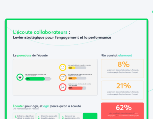 Seulement 8% des collaborateurs français sont engagés, le taux le plus bas d'Europe. Le paradoxe ? 78% des dirigeants pensent encourager le feedback, mais 41% des salariés ont quitté un emploi par manque d'écoute. Notre infographie révèle une méthodologie en 7 étapes pour placer l'écoute collaborateur au cœur de votre stratégie : de la définition d'objectifs à la pérennisation de la démarche. Écouter pour agir, agir parce qu'on a écouté.